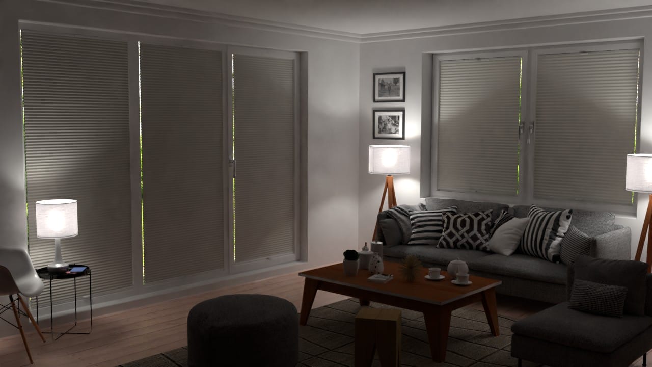 Das Fenster Plissee liegt vor dem Rahmen, was von Vorteil ist für Verdunkelungszwecke.
