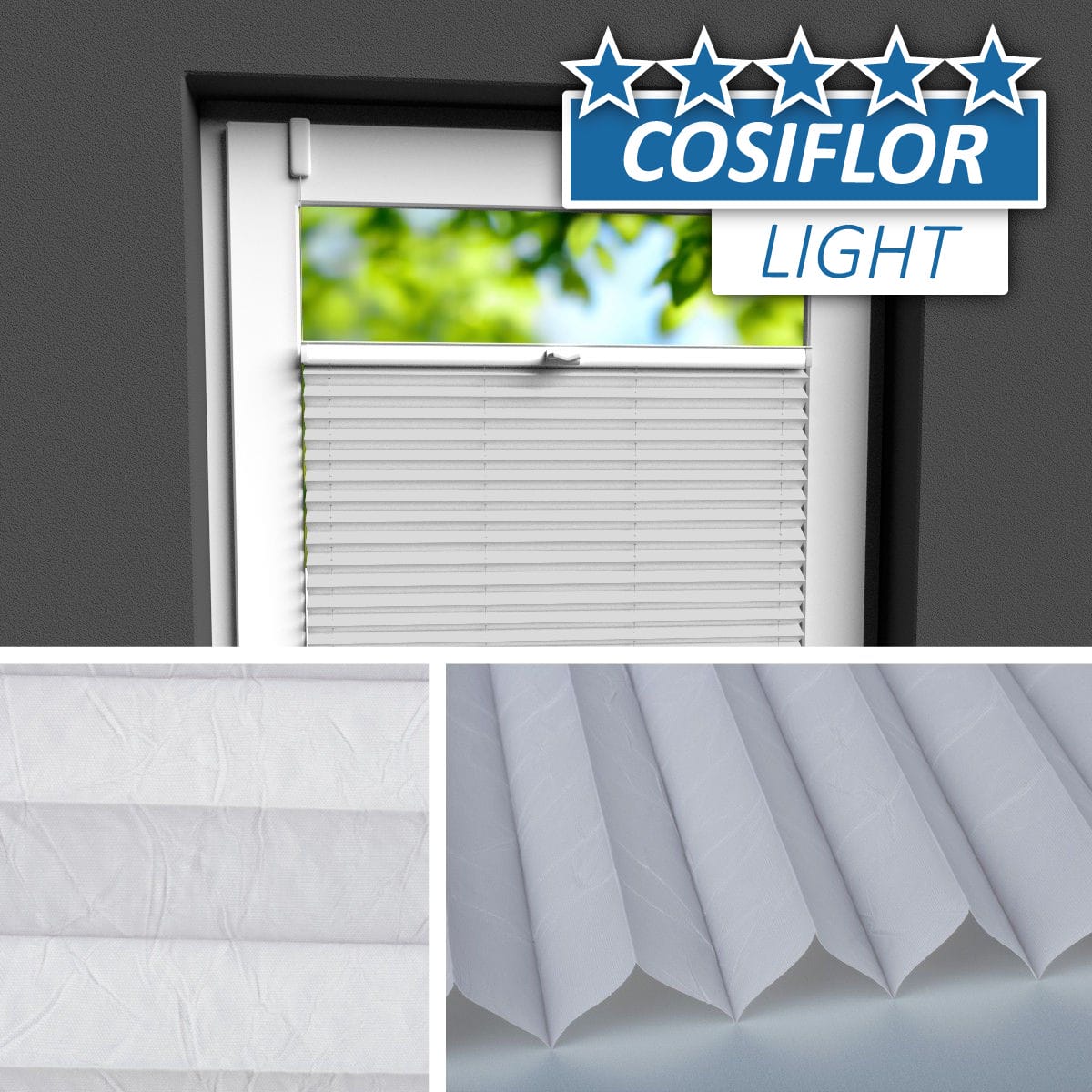 Seit Jahren einer der beliebtesten Plisseestoffe mit echter Knitterstruktur. Blickdichter Stoff mit Perlmuttbeschichtung auf der Rückseite, welche Sonnenlicht reflektiert und der Wärmeentwicklung vorbeugt.