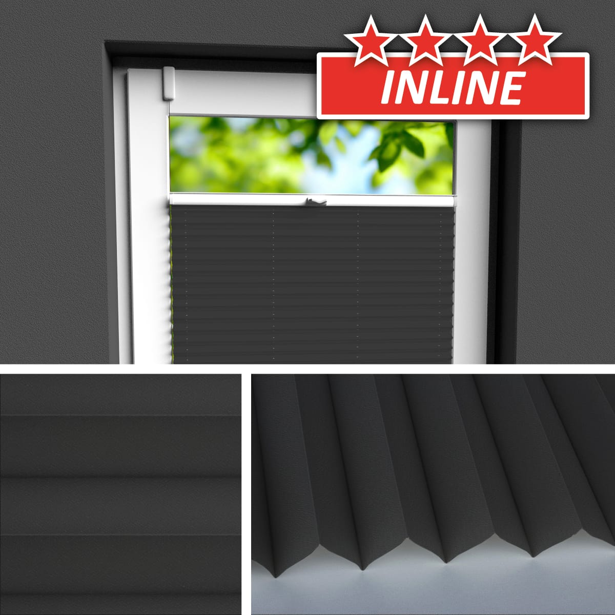 Info: Empfohlene Befestigung direkt vor der Scheibe. Unauffälligste Befestigungsart. Plissee und Fenster bilden eine Einheit wie aus einem Guss.