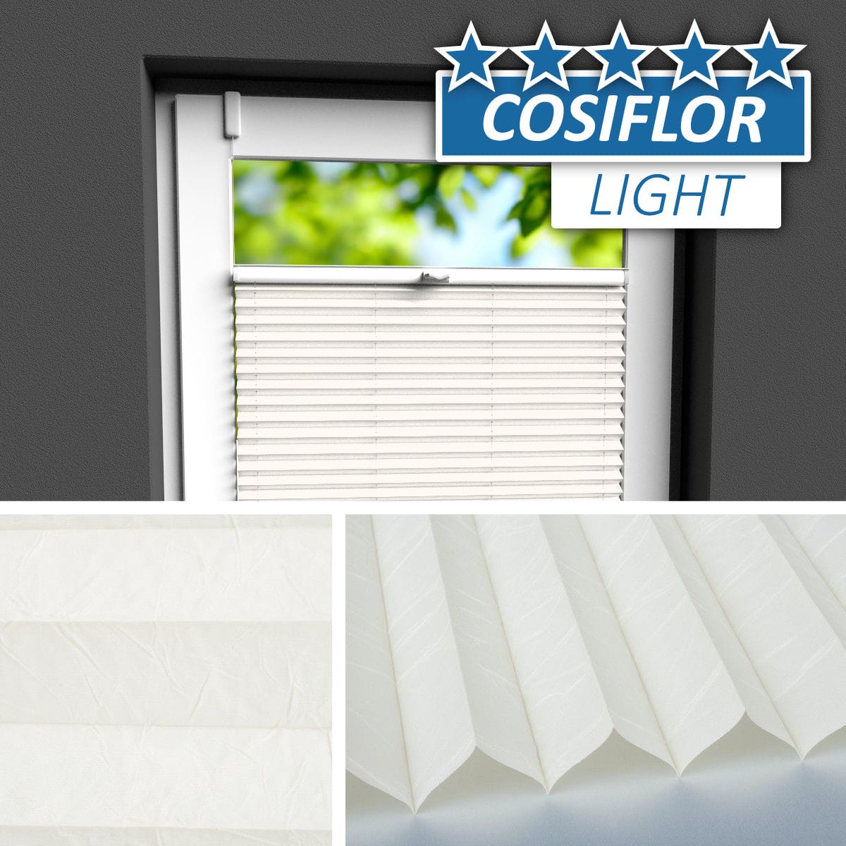 Seit Jahren einer der beliebtesten Plisseestoffe mit echter Knitterstruktur. Blickdichter Stoff mit Perlmuttbeschichtung auf der Rückseite, welche Sonnenlicht reflektiert und der Wärmeentwicklung vorbeugt.