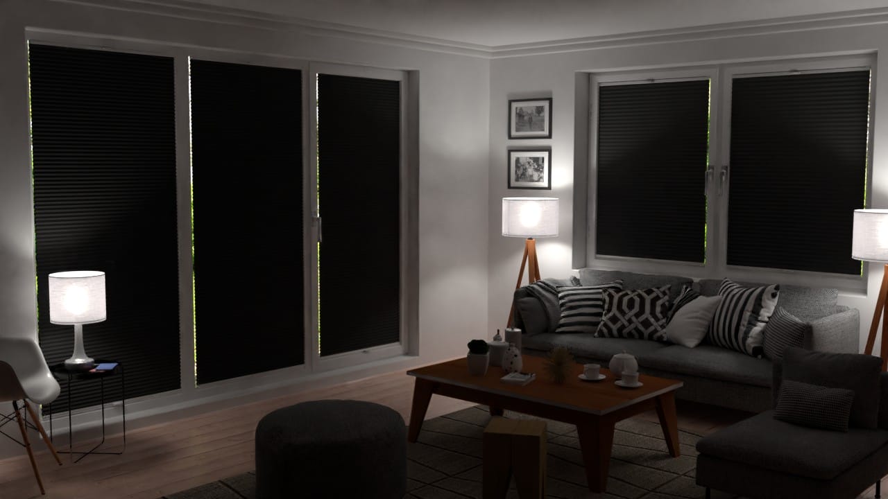 Vorderseite farbig dekorativ, Rückseite hell, innenliegende Beschichtung gegen Wärme. Hinweis: Zur erforderlichen Hinterlüftung des Wabenplissees mit Verdunkelungsstoff ist eine Montage mit mindestens 3-5 mm Abstand zur Fensterscheibe erforderlich. Lichteinfall ist aufgrund der Falten an den Seiten möglich.