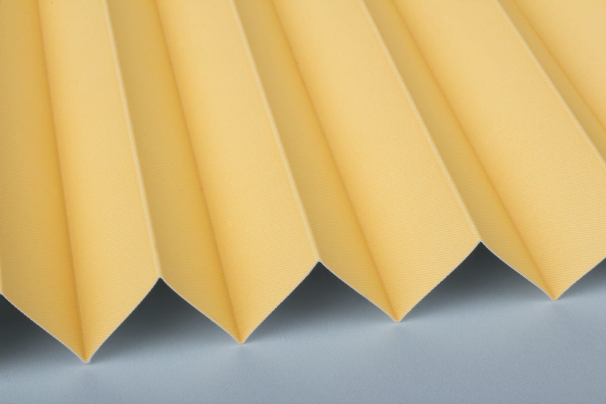 Ein fein gewebter Verdunkelungsstoff mit einer farbigen Innen- und einer weißen Rückseite, welche gut das Sonnenlicht reflektiert.